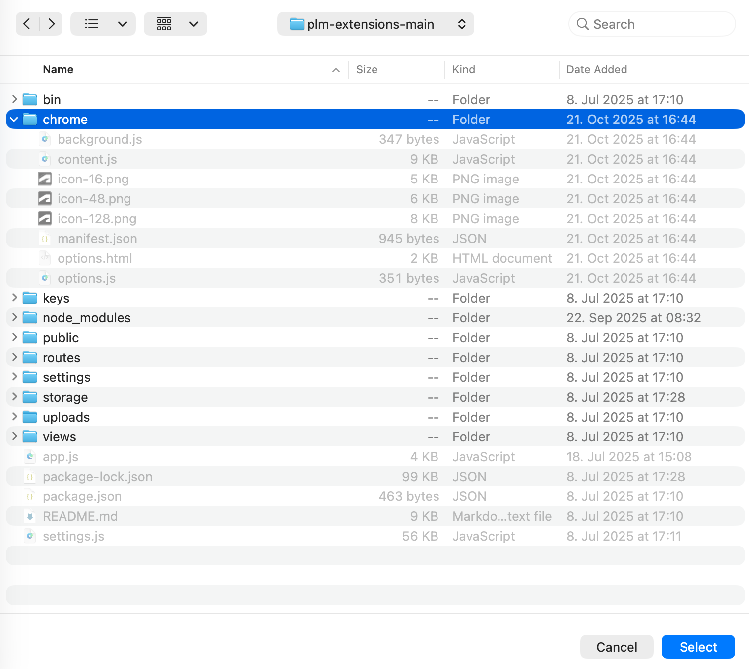 Note that all changes to the files in folder /chrome require a relaod of the given extension. For example, if you change the default PLM UX Extensions server URL in file content.js, you have to return to this list of extensions and enforce a reload using the given controls:
